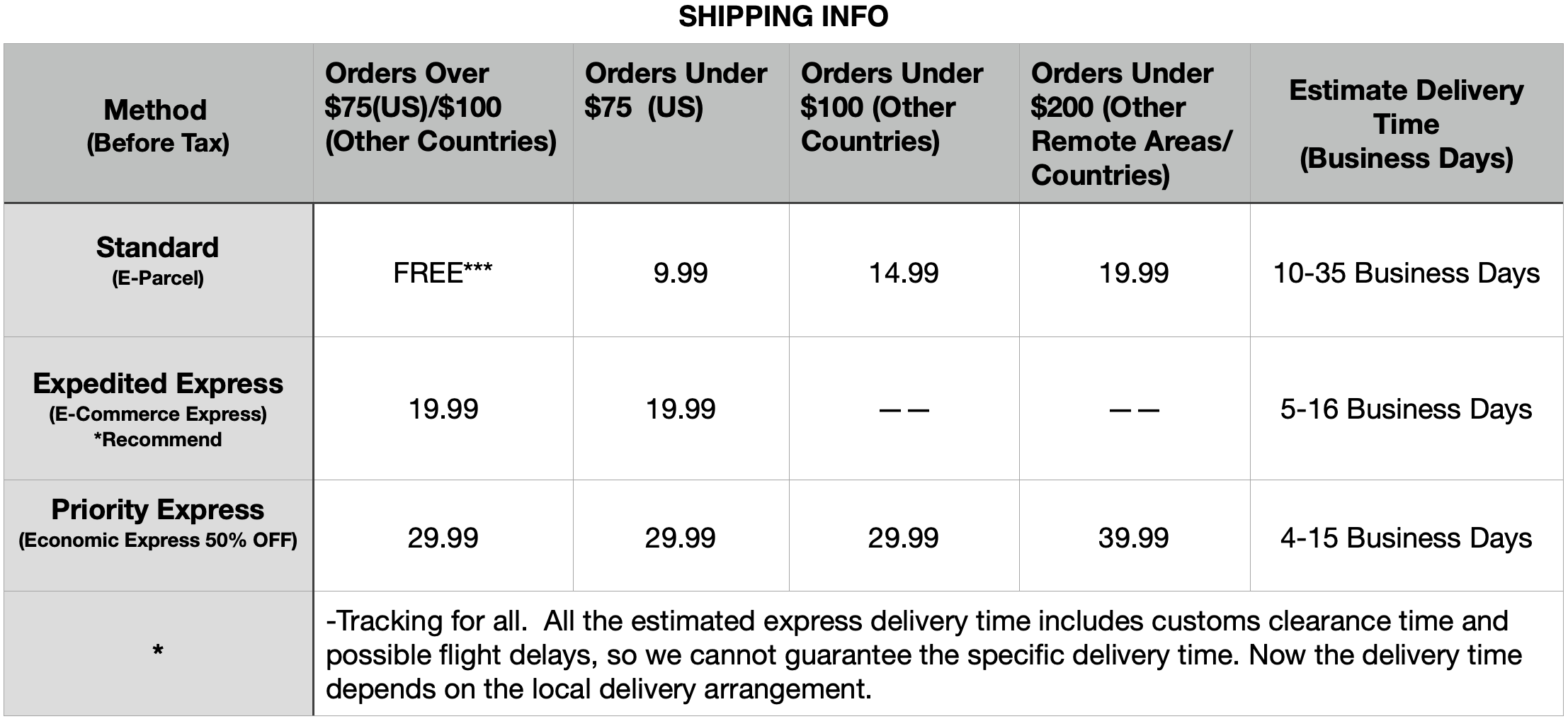 3) Shipping Time does not include a 1-4 business days processing period required to process your order from the date your order is placed.